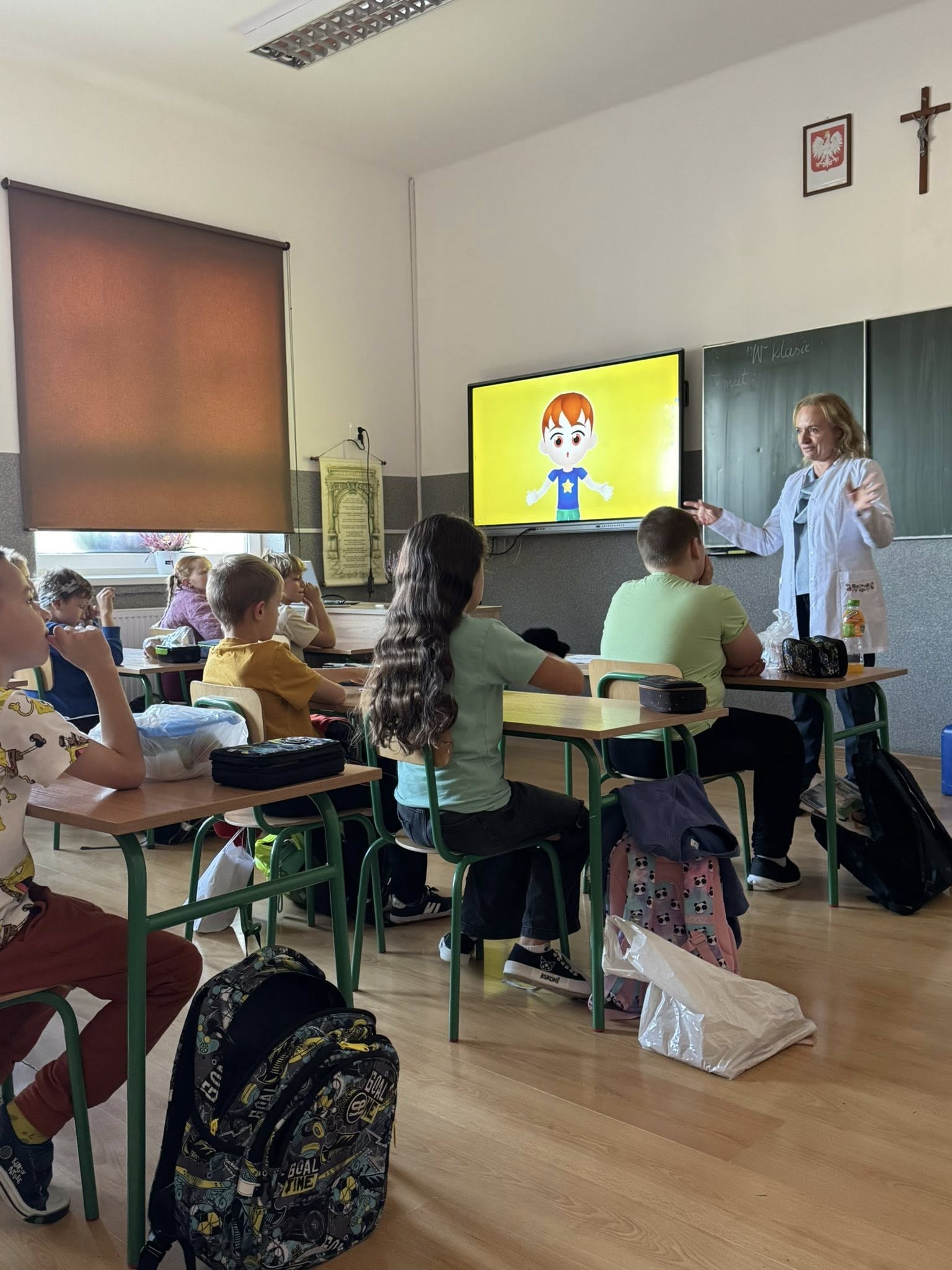 5 listopada w ramach Dnia Zdrowego Śniadania odbyło się spotkanie z pielęgniarką na temat znaczenia zdrowego odżywiania. Pielęgniarka opowiedziała dzieciom, dlaczego pierwszy posiłek dnia jest tak ważny dla zdrowia, koncentracji i energii do nauki. Uczniowie dowiedzieli się, jak powinno wyglądać pełnowartościowe śniadanie i które produkty warto wybierać. Podczas zajęć dzieci aktywnie uczestniczyły w rozmowie.