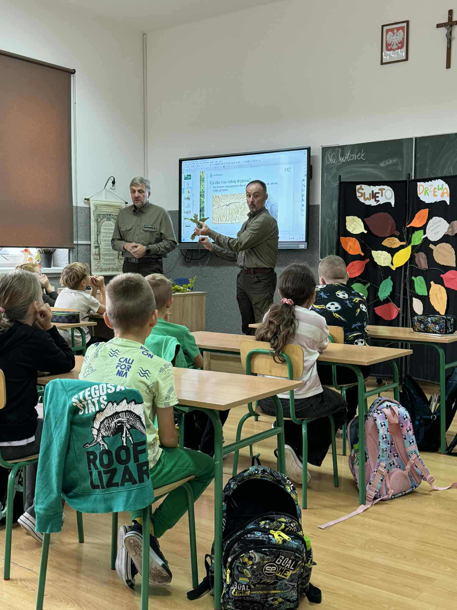 Drzewa.. Jak ważne są w przyrodzie i jak istotne znaczenie mają dla każdego z nas? Odpowiedzi na to i na wiele innych pytań udzielili całej społeczności szkolnej nasi Szanowni Goście z Nadleśnictwa. Spotkanie to było zwieńczeniem Dnia Drzewa odbywającego się 17.10.2025 w naszej szkole. Dodatkowo uczniowie otrzymali sadzonki oraz postępując według instrukcji stworzyli wspólne dzieło- DRZEWO EMOCJI, ucząc się, że każda emocja ma znaczenie, bo tworzy nasz charakter i osobowość.
