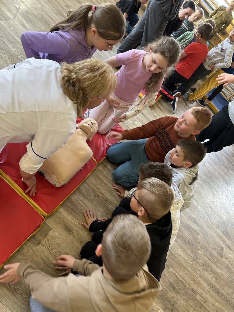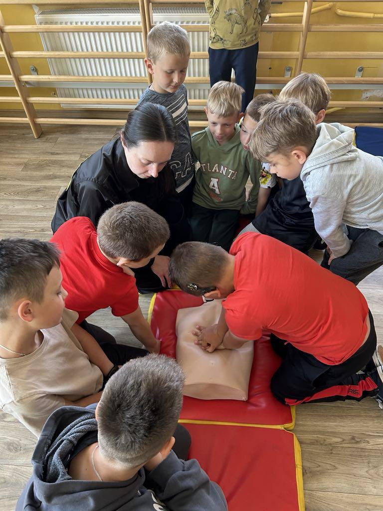 Opowiedziały uczniom w jaki sposób udziela się pierwszej pomocy zanim przyjedzie pogotowie ratunkowe. Zademonstrowały jak należy ułożyć poszkodowanego w pozycji bezpiecznej, a także jak prawidłowo wykonywać resuscytację krążeniowo-oddechową.