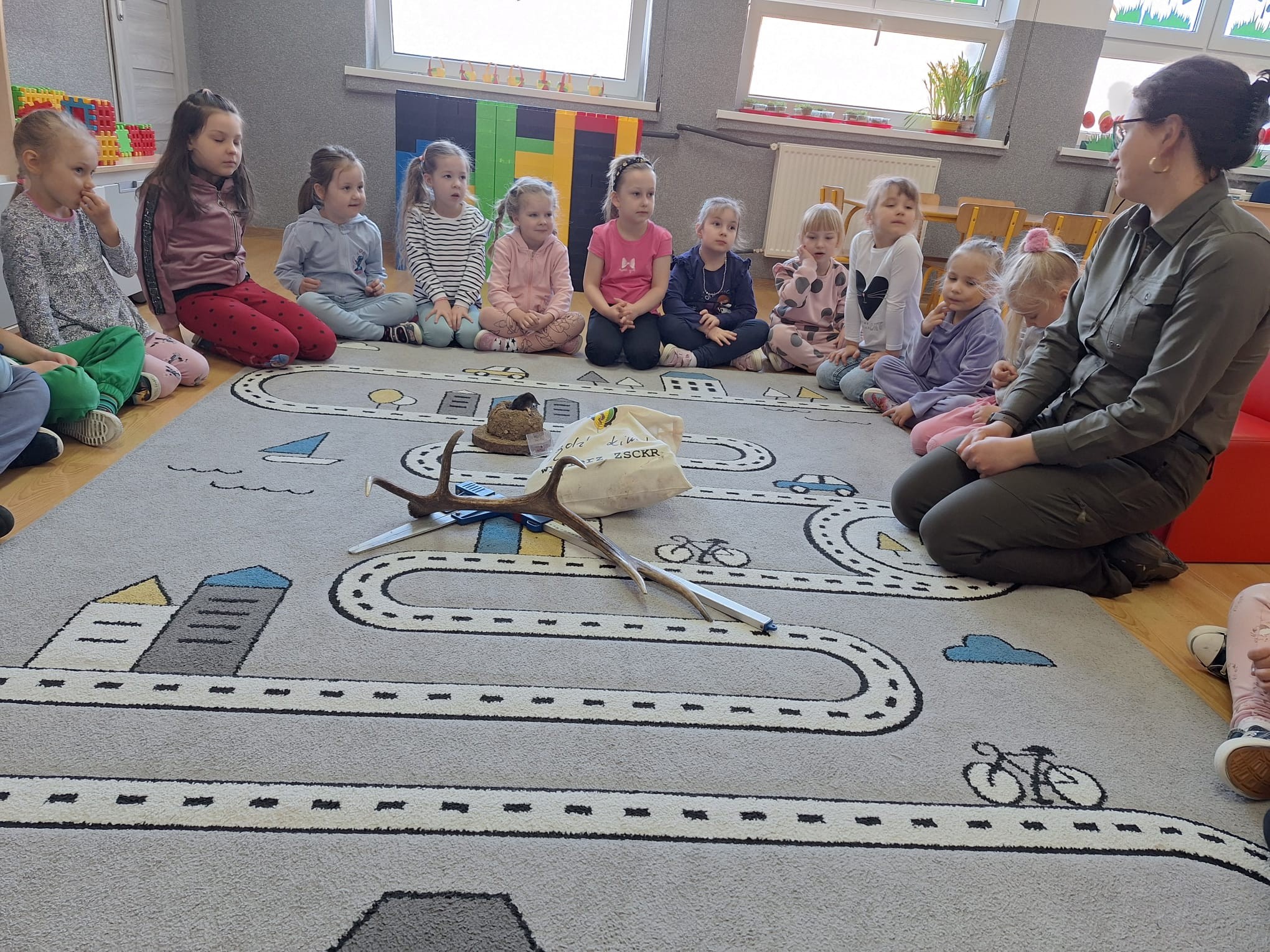 Podczas zajęć dzieci mogły obejrzeć również spreparowane zwierzę - kreta oraz zapoznać się ze śladami dzikich zwierząt z naszych lasów i wykazać się ich znajomością .